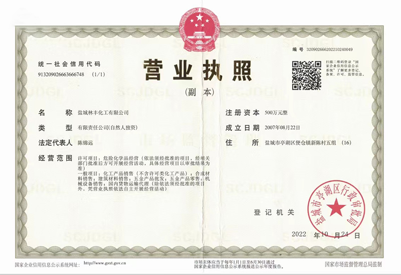 盐城林丰化工有限公司电话:13961934563联系人:吉总网址:www.yclfhg.com地址:江苏省盐城市亭湖区便仓镇工业园